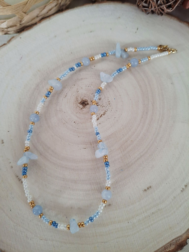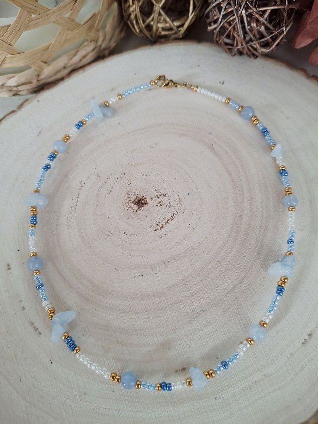 Le collier Azur, doux mélange de rocailles bleues, blanches et dorées, de jade bleu et d'aqua-marine