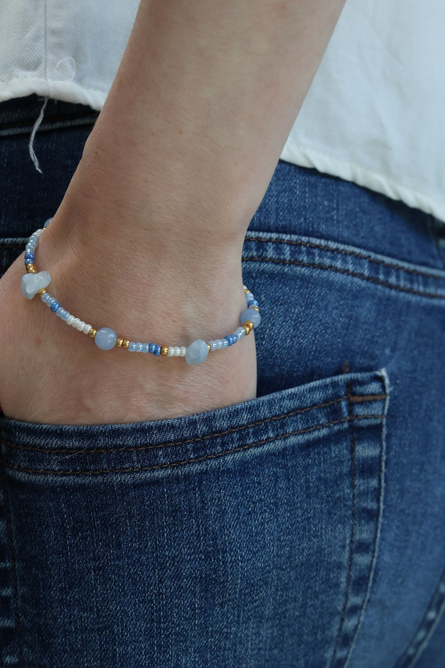 Le bracelet Azur, doux mélange de rocailles bleues, blanches et dorées, de jade bleu et d'aqua-marine